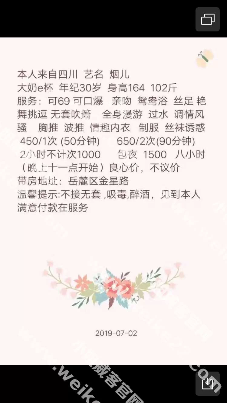 之前在qq群看到过有兄弟验证了,刚好在附近。就过去了,在岳麓区的私人性质的旅馆。环境就那样吧!也不陪洗澡的!不过口活还是不错,口出来后就帮按了下背。其他项目,我也不太喜欢就没要做了。第二水就不说!个人觉得年纪起码35岁往上走了,好在听话也挺配合的。毕竟年龄摆在这。可以抠b….也没有像那些年轻妹纸一样,这也不行那也不行的。总结就是,不太在意颜值和年龄的可以去试试。年轻的时候应该也有75分的颜值吧!还有,是做完才给的钱。不会像一些论坛里朋友讲的那样,给了钱就变脸的货色。见到真人还是有点差距,好在胸大屁股大高,聊了一会天不停的挑逗你,来了两发,走人。总体说还不错,喜欢熟女的应该很喜欢。