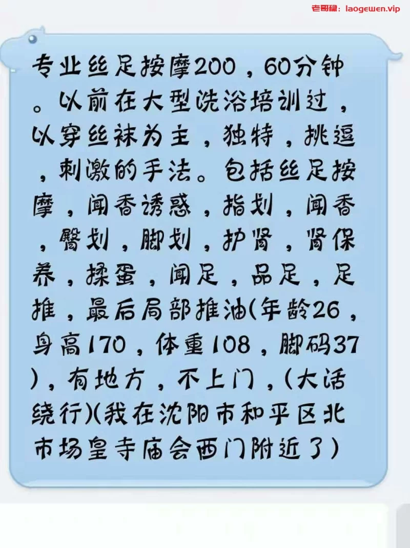 本来想找个无大的放松一下,遇见这个奇葩。一顿跟你聊啊。叫的还难听。也没按摩,就是手指在你背后划。最后给你部位抹点油,就开始给你打。之前介绍的项目都没有,让穿丝袜还加钱。看见这个介绍就别去了。200打个飞机,体验还特别差。