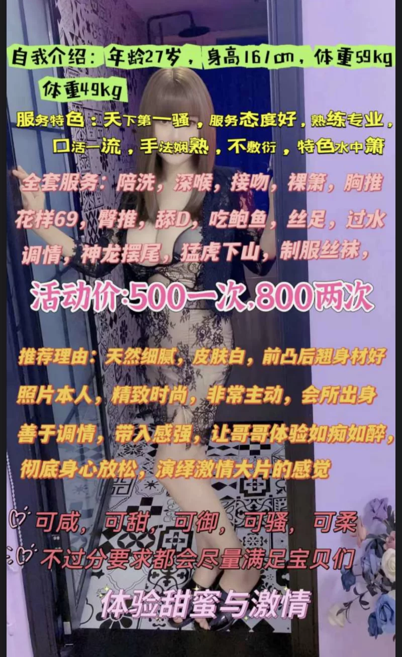 超级好看妹子,服务到位,不限次数,可无套射,太漂亮了,长相清纯皮肤又白又嫩,完全是初恋女友的模板,她的身体好敏感,摸一下奶子都要尖叫,挺敏感的,奶子雪白粉嫩吸一下,身体都开始颤抖,感觉很不错,洗完澡后,我们开始滚到床上干起来,三点粉的不行,小穴和她的脸一样嫩, 看到那个粉粉的洞马上对准-插到底特别兴奋使劲的抽插爽到爆炸, 小穴淫水直流,各种姿势都搞一番,高潮了好几次,根本停不下来,妹妹一点都不催人,特别的投入,身体都软完了,抱起来搞和后入最有感觉,像个小妖精似的,越来越骚让我欲罢不能,带来不一般的感觉,每次有时间都要尝试